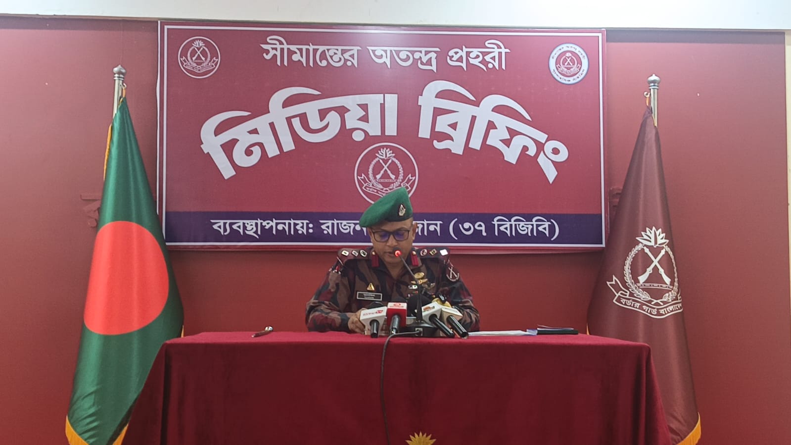 বৃহস্পতিবার সকালে রাঙামাটির লংগদু উপজেলার রাজনগর ব্যাটালিয়ন সদরে আয়োজিত এক প্রেস ব্রিফিংয়ে এসব কথা জানান রাজনগর জোনের জোন অধিনায়ক লে. কর্নেল শাহ্ নেওয়াজ তাসকিন পিএসসি।তিনি বলেন, সীমান্তে রাজনগর ব্যাটালিয়ন (৩৭ বিজিবি) বর্তমানে সর্বকালের সর্বোচ্চ সতর্কতা অবস্থানে রয়েছে।