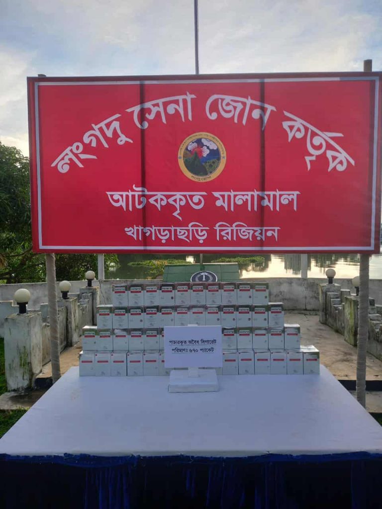 রাঙামাটির বাঘাইছড়ি উপজেলার খেদারমারা ইউনিয়নের হীরারচর ও লংগদু’র কালাপাকুইজ্জ্যার গাঁথাছড়া এলাকায় সেনাবাহিনীর বিশেষ অভিযানে বিপুল পরিমাণ ভারতীয় অবৈধ সিগারেট জব্দ করা হয়েছে। মঙ্গলবার রাতে লংগদু জোনের জোন কমান্ডার লে. কর্নেল মীর মোরশেদ, এসপিপি, পিএসসি’র নির্দেশে ভারপ্রাপ্ত উপ-অধিনায়ক মেজর রিফাত উদ্দিন লিওন ও ক্যাপ্টেন রাফিউল ইসলাম রাহাতের নেতৃত্বে সেনাবাহিনীর একটি চৌকস দল অভিযান পরিচালনা করে।